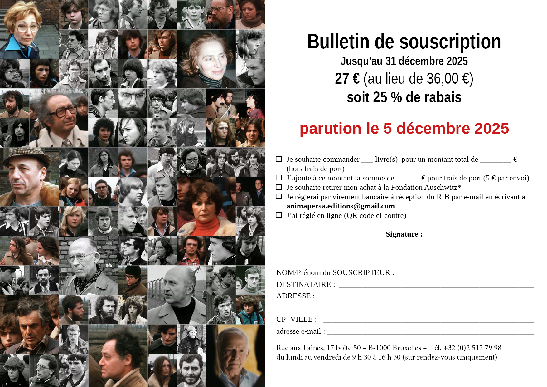 Pour devenir membre de l'ASBL Mémoire Auschwitz, il suffit de nous contacter et de verser, ensuite, la somme de 50,00 € sur le compte IBAN BE55 3100 7805 1744 – BIC BBRUBEBB avec la communication « Cotisation 2025 ». Ceci donne droit aux deux numéros de 2025 de notre revue scientifique Témoigner. Entre histoire et mémoire.